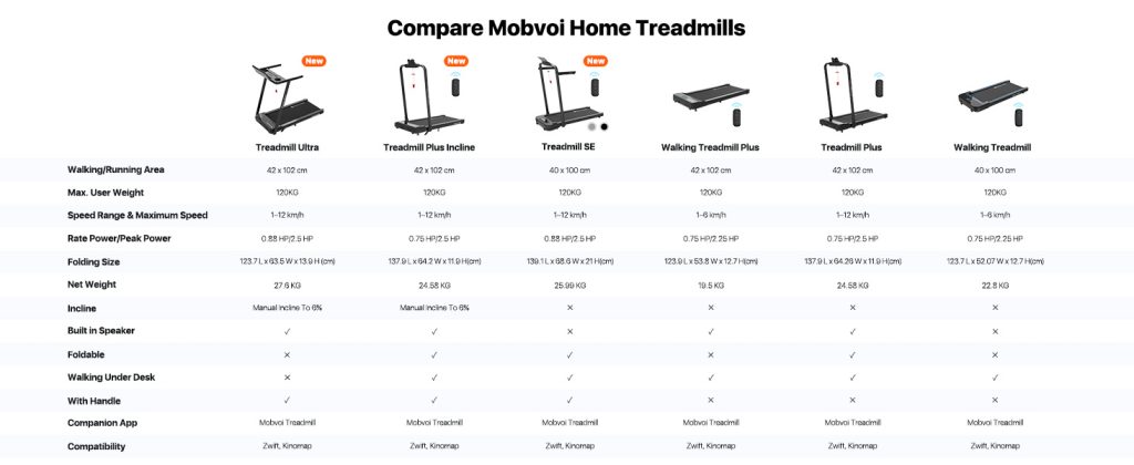 Before diving into individual models, it is worth addressing the elephant in the room: Mobvoi’s product names are hugely confusing. There are two completely different products called “Plus”, the Walking Treadmill Plus (a walking pad, 3.72 mph max, no handrails) and the Home Treadmill Plus (a compact treadmill, 7.45 mph, with foldable handrails and a safety key).