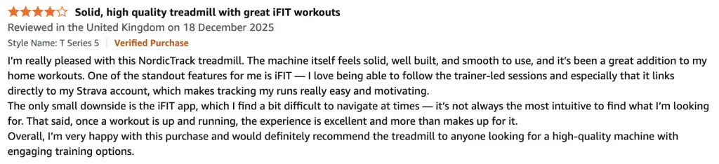 Almost 29,000 reviews from British buyers averaging 4.4 out of 5 is hard to argue with. The lifetime frame warranty and 10 year motor warranty back it up. NordicTrack is not hedging its bets on this one.
