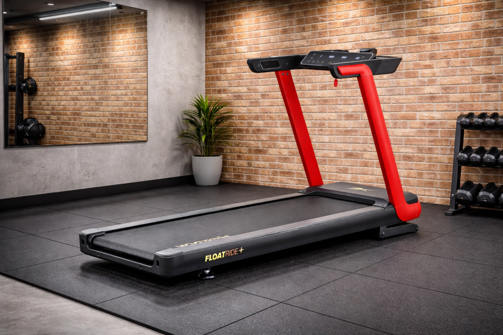 Entry to Floatride: fixed deck for superior rigidity/gym-like feel, responsive Floatride+ cushioning (energy return), quiet eco-Kinetic motor. Non-folding trade-off for stability.